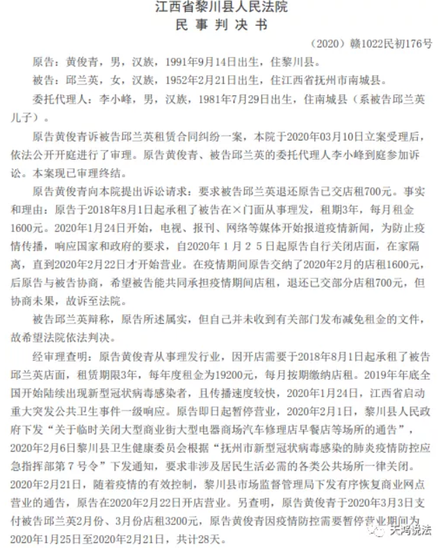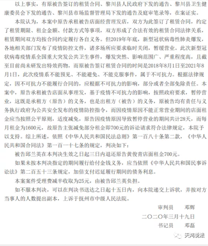 近日,江西省黎川县人民法院适用不可抗力规则审结一起因新型冠状病毒疫情引起的租赁合同纠纷。